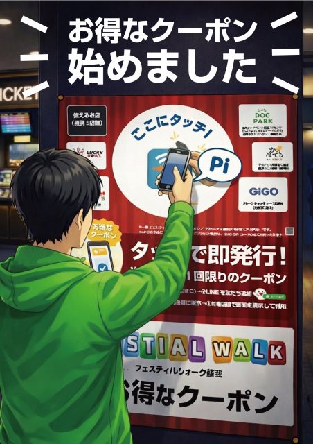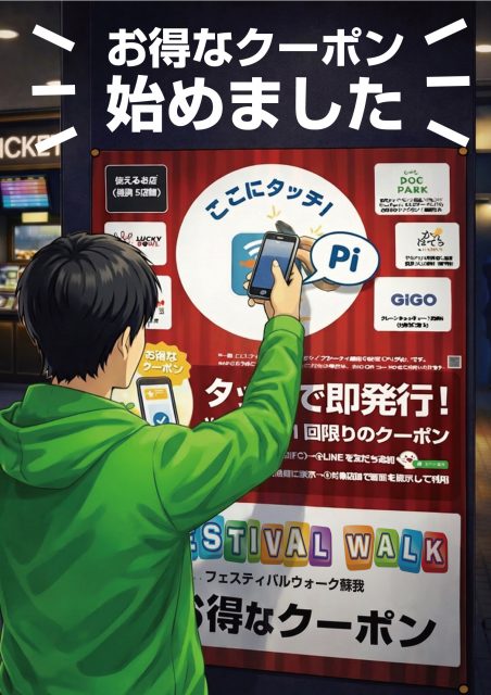 シネマ半券サービスのご案内 シネマをご利用のお客様へ、嬉しいお知らせです。 NFC対応スマートフォンを使って、シネマ内に設置されたポスターにタッチするだけで、フェスティバルウォークでご利用いただけるお得なクーポンをプレゼントいたします。 ご利用方法はとても簡単です。館内の対象ポスターにスマートフォンをタッチし、簡単なアンケートにご回答いただくだけで、その場でクーポンをお受け取りいただけます。 この機会にぜひ、便利でお得なサービスをお試しください。皆さまのご利用をお待ちしております。